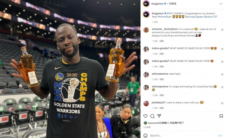 太会了!詹姆斯晒追梦拿自己品牌洋酒照片:恭喜兄弟!冠军#主队